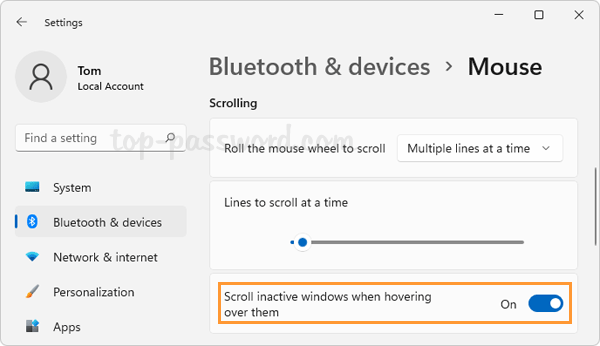 - 在滚动部分下,您可以打开或关闭标题为“当我将鼠标悬停在非活动窗口上时滚动它们”。