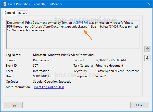 打印机使用跟踪最有趣的事件是事件 307。双击每个 307 事件,它会告诉您打印了哪个文档、使用了多少页或份数以及打印时间。