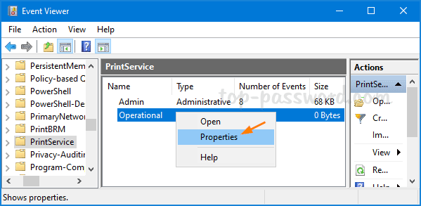 Applications and Services Logs -> Microsoft -> Windows -> PrintService。右键单击操作项目并选择特性。