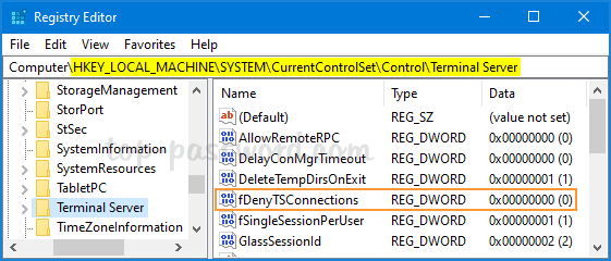 连接到远程计算机的注册表后,导航到以下位置:HKEY_LOCAL_MACHINE\SYSTEM\CurrentControlSet\Control\Terminal Server。在右侧窗格中,双击 DWORDfDenyTSConnections并将其值从 1 更改为 0。