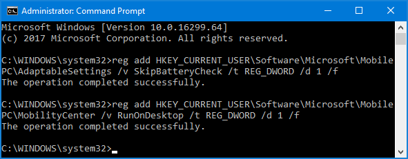 reg add HKEY_CURRENT_USER\Software\Microsoft\MobilePC\AdaptableSettings /v SkipBatteryCheck /t REG_DWORD /d 1 /f