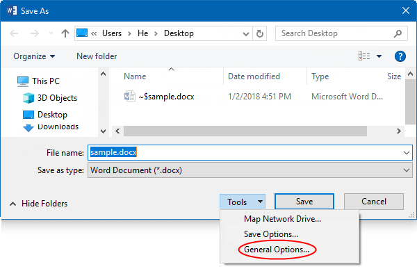 步骤 1:打开一个文档。点击文件 -> 另存为。点击浏览器选择要保存此文档的位置。在另存为对话框中,键入文件名。然后,单击工具列表,然后选择一般选项。