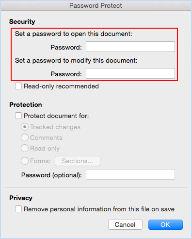 第 2 步:下安全,您可以选择是否输入密码来打开文档、修改文档或同时输入两者。再次输入每个密码进行确认。