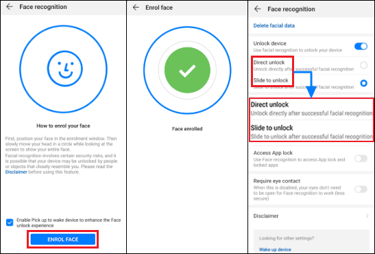 步骤2:选择启用拾取唤醒设备以增强人脸识别体验或不,然后点击登记人脸。之后系统会引导您进行人脸登记。最后,决定直接解锁或滑动解锁您的华为手机。