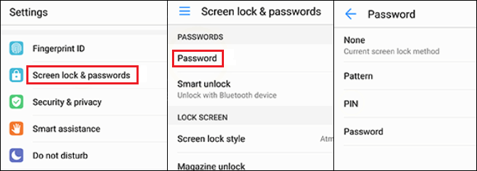 在应用下面的方式1/2/3之前,需要访问设置>安全>屏幕锁定首先在你的华为手机上。