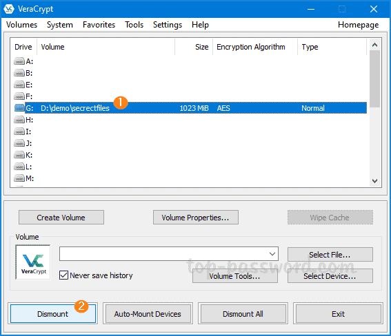当您不再需要使用 VeraCrypt 卷时,请不要忘记卸载它。在 VeraCrypt 界面中,选择已安装卷的驱动器盘符,然后单击下马。