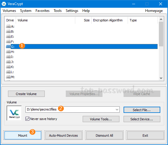 - 再次打开 VeraCrypt,选择一个未使用的驱动器号,然后单击“选择文件”找到受保护的虚拟磁盘映像,然后单击山。