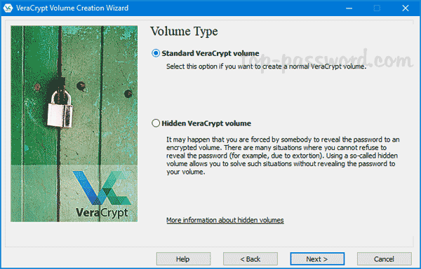 - VeraCrypt 支持两种不同类型的加密卷。这里我们选择“标准 VeraCrypt 卷”。