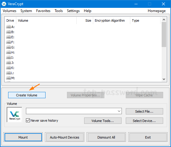 - 当您打开 VeraCrypt 时,您将看到未使用的驱动器号的列表。首先,我们需要创建一个受保护的虚拟磁盘映像(也称为“加密文件容器”)。单击创建卷按钮。