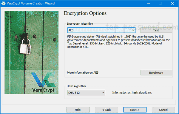 - 选择您的加密选项。默认设置为AES和SHA-512对于大多数用途来说已经足够了。