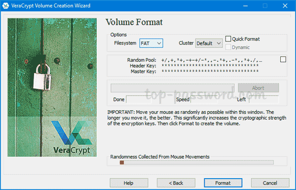 - 选择您要使用的文件系统。建议选择NTFS因此您将能够使用大于 4GB 的文件。为了生成强大的加密密钥,只需随机移动鼠标直到蓝色条到达末尾即可。点击格式。