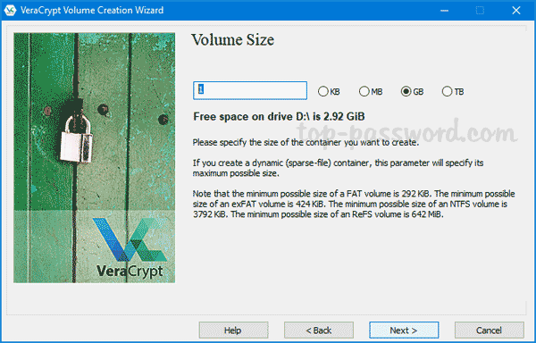 - 输入您的卷大小。它必须足够大以容纳您的敏感文件。