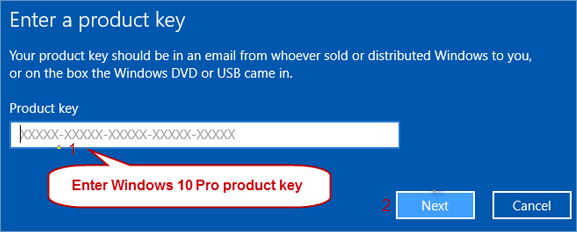 步骤 3:输入 Windows 10 专业版产品密钥并单击下一个开始升级到 Windows 10 Pro。