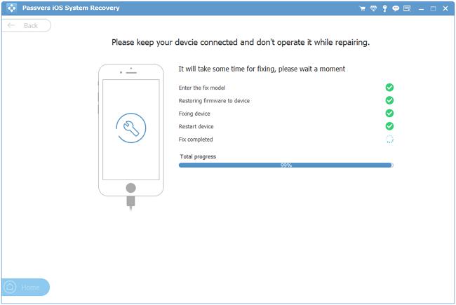 3. 文件准备好后,点击下一个。修复过程开始。 Passvers 重建固件并恢复 iOS 核心。一旦该条达到 100%,您的 iPhone 将重新正常开机。