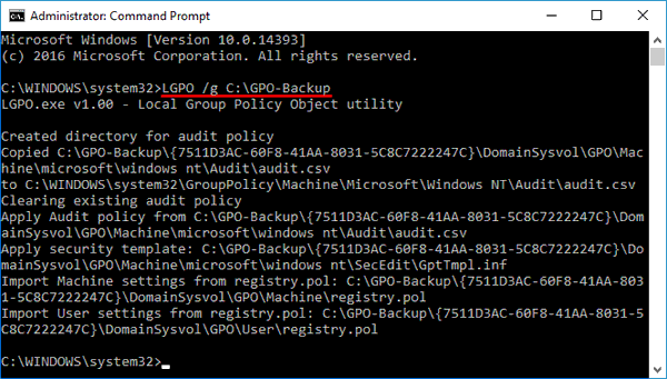 要从备份恢复本地组策略设置,请通过运行以下命令导入它们: