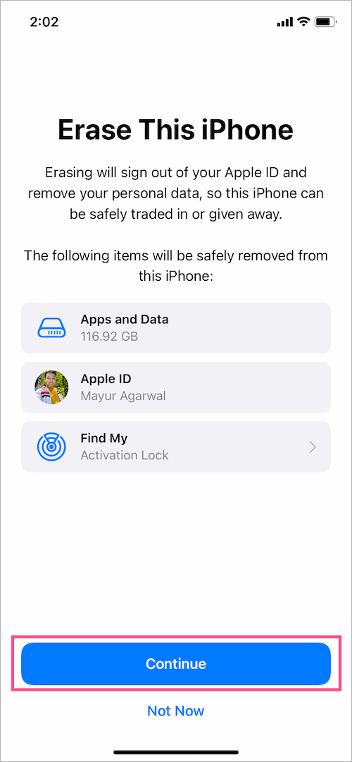 - 轻敲 ”继续”在“擦除此 iPhone”屏幕上。