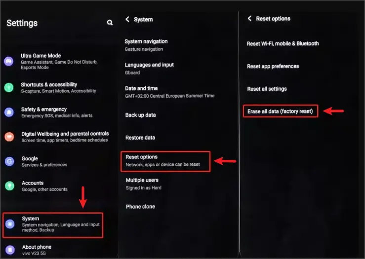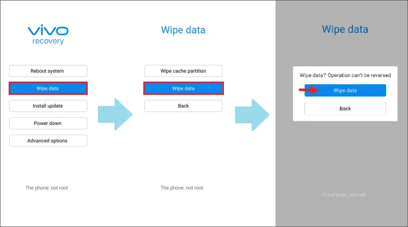 如果您的手机未登录Google帐户并且无法访问系统,则可以使用恢复模式对Vivo设备进行硬重置。此引导模式允许用户执行各种维护操作,包括在无法正常引导系统时强制设备恢复出厂设置。