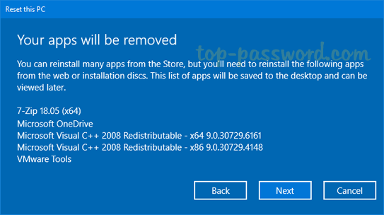 如果您选择了保留我的文件”选项,它不仅将删除从Windows Store中安装的所有应用程序,还将卸载屏幕上显示的程序。下一个确认。