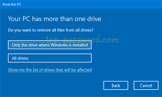 如果您选择了删除所有内容”选项,下一个屏幕将使您选择从安装窗口的驱动器或连接到PC的所有驱动器中删除所有内容。
