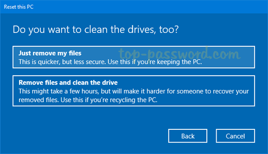 选择驱动器后,将要求您“只需删除我的文件“ 或者 ”删除文件并清洁驱动器“。第二个选项将安全删除您的驱动器并使您的文件无法恢复,如果您打算出售或赠送PC,这是一个不错的选择。如果保留计算机,请选择速度的第一个选项。