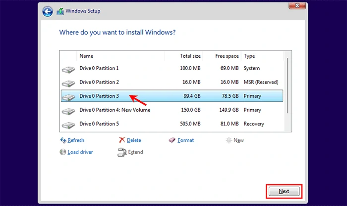 步骤9选择要安装 Windows 11 的驱动器分区,然后单击“下一步”。 Windows 将擦除您的安装驱动器并在您的计算机上安装 Windows 11 操作系统的全新副本。