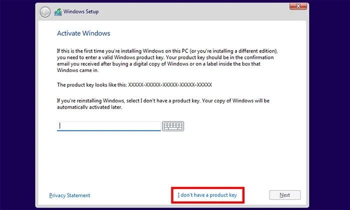 步骤5在激活 Windows 页面上,单击我没有产品密钥。