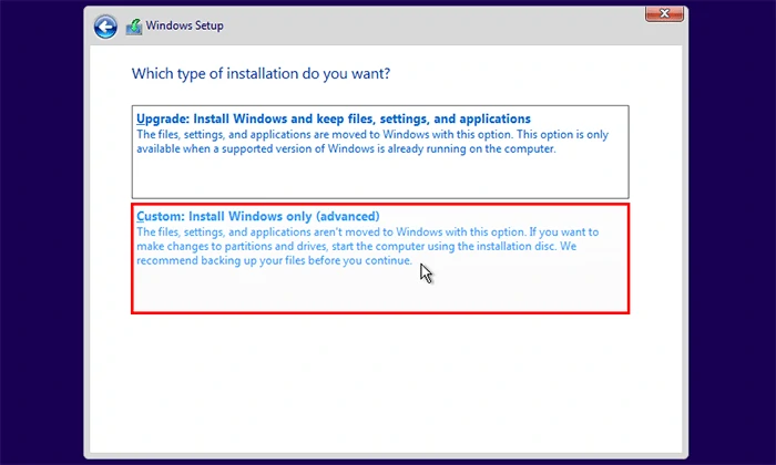 步骤8选择想要的安装类型。选择升级选项将保留您的文件,包括您的管理员密码。由于您没有管理员密码,因此选择自定义:仅安装 Windows(高级)。