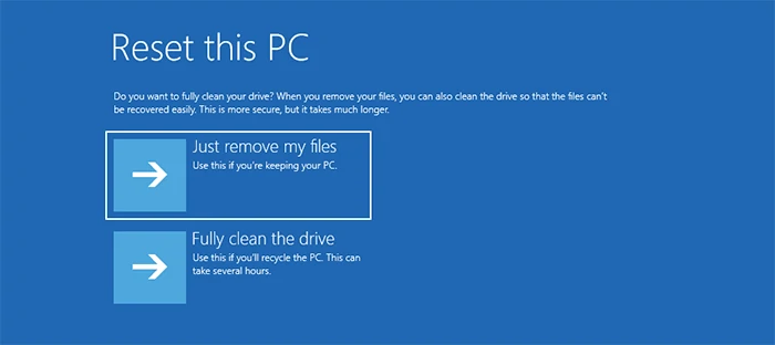 步骤6选择只需删除我的文件。但如果您想出售或赠送您的电脑,最好选择彻底清洁驱动器。