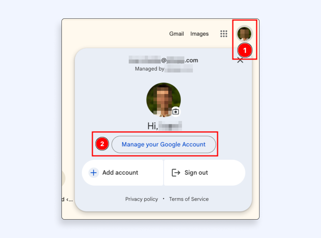 - 登录并单击您的个人资料图片→管理您的Google帐户。