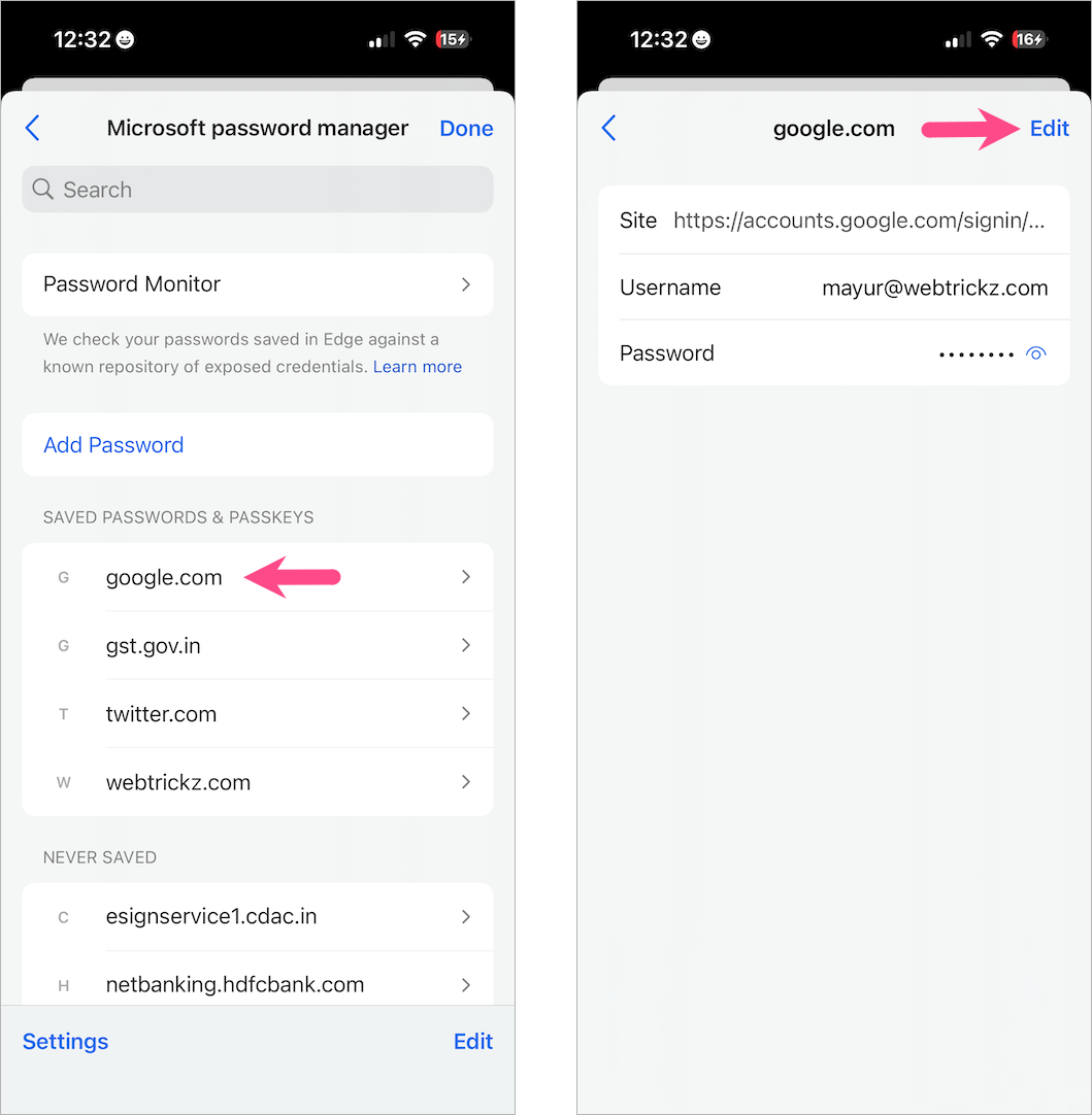 替代方式 (iPhone)– 打开 Microsoft 密码管理器,然后向左滑动您要删除的网站名称。再次点击删除进行确认。