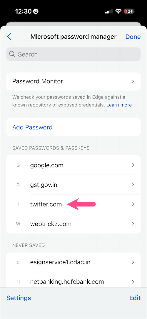或者,导航至菜单>设置>密码管理器访问您在 iPhone 或 Android 上的 Edge 中保存的密码。