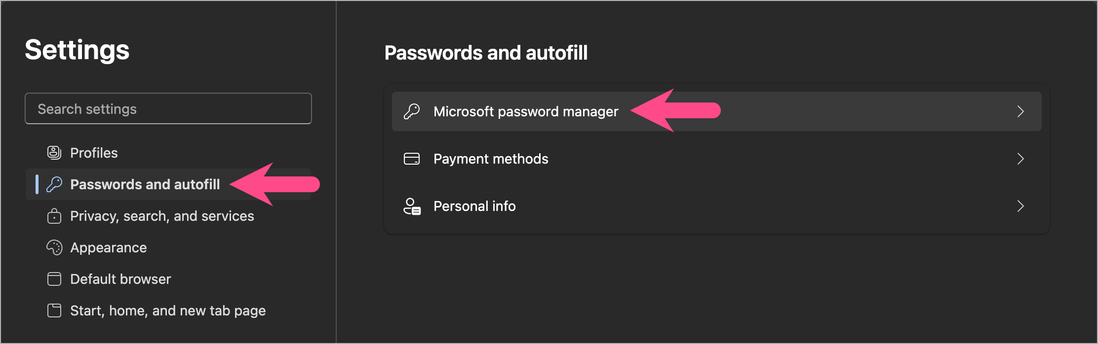 当您在 Edge 中保存密码时,它会存储在Microsoft Edge 密码管理器并同步到您的 Microsoft 帐户。您可以在以下位置访问它们: