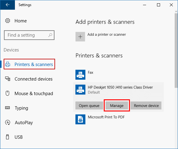 第2步:在右侧打印机和扫描仪选项卡,单击打印机,然后单击管理选项。