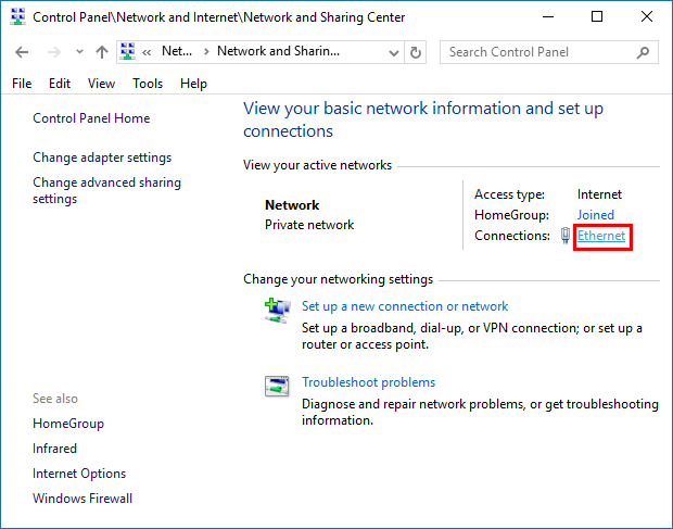单击当前网络连接(以太网)链接到查看此连接的状态。