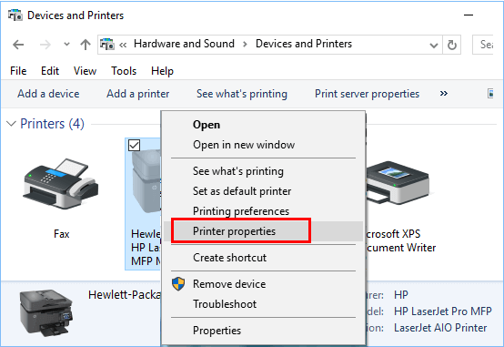 步骤 3:在“设备和打印机”屏幕上,右键单击与计算机连接的打印机,然后从菜单中选择“打印机属性”。前往步骤4以下。
