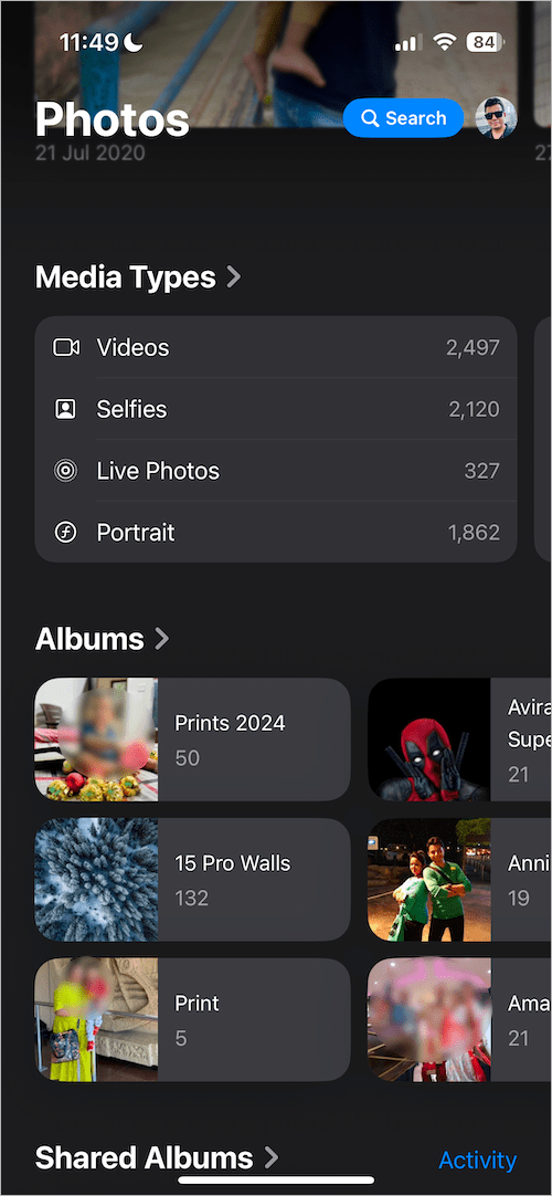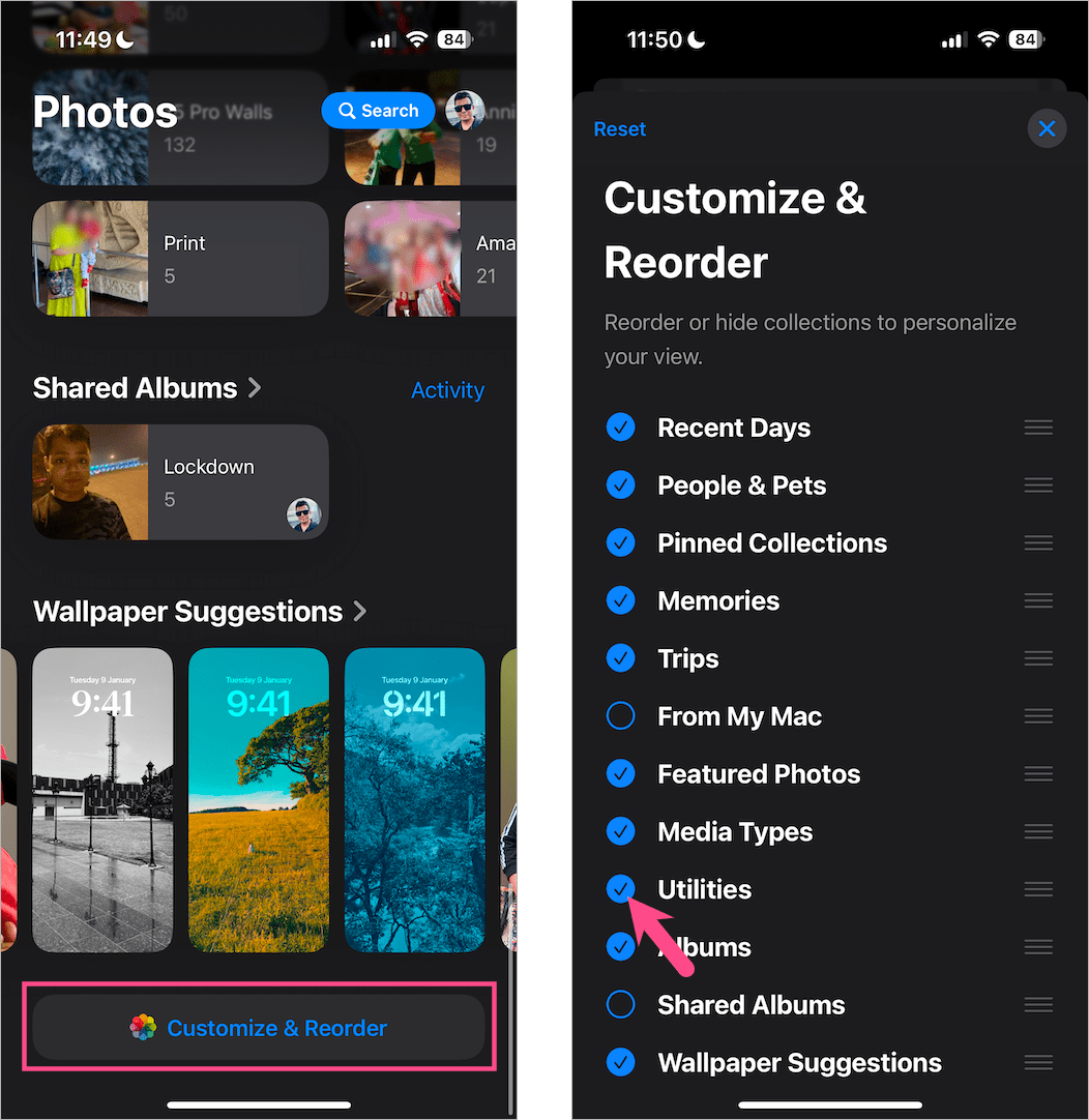 由于该应用程序现在允许您重新排序和隐藏任何集合,因此您可能在不知不觉中隐藏了“实用程序”集合。这样做会从照片应用程序中删除实用程序,并且它不再显示在“媒体类型”下方。