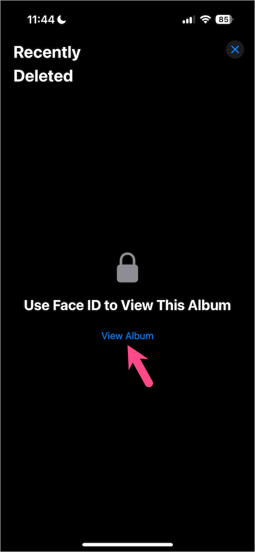 - 轻敲 '查看相册'并使用 Face ID 或 Touch ID 查看您最近删除的相册。