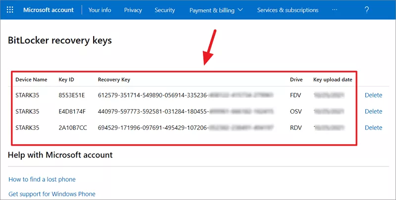 1. 从 Microsoft 帐户中找到 BitLocker 恢复密钥