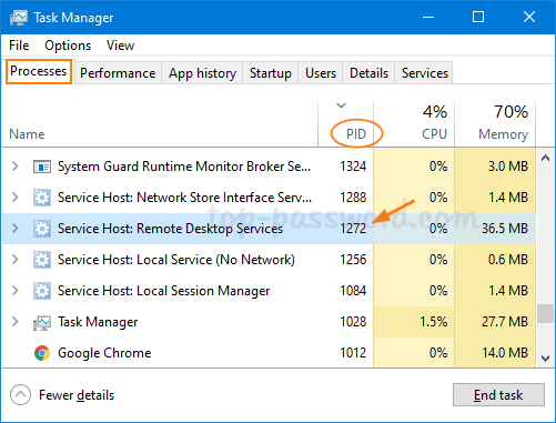 要通过进程 ID 查找进程名称,请打开任务管理器并转到流程选项卡。通过单击标有“的列标题对进程列表进行排序PID在我们的例子中,与 PID 1272 关联的进程是远程桌面服务。