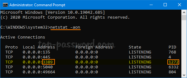它将显示当前在您的计算机上侦听的 TCP 和 UDP 端口的列表。在我们的例子中,TCP 端口 3389 由进程 ID (PID) 为 1272 的进程使用。