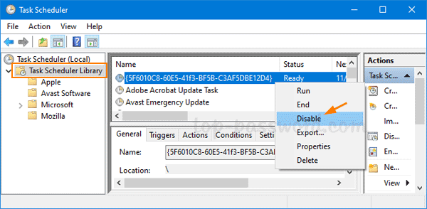 - 现在,您需要禁用从上述命令中找到的那些任务。打开任务计划程序并展开“任务调度程序库”文件夹,右键单击每个目标任务并选择禁用。