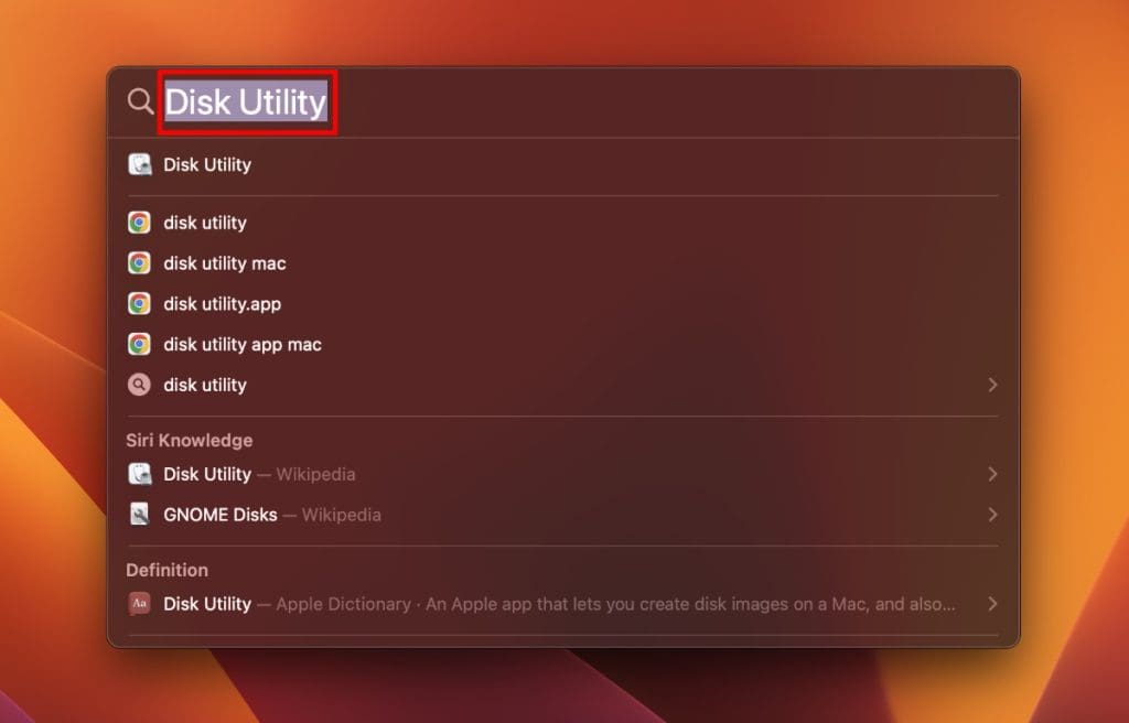 - 启动磁盘实用程序,方法是:Finder > 应用程序 > 实用程序 > 磁盘实用程序。或者,您可以在以下位置搜索它:聚光灯(命令 ⌘ + 空格键)通过输入磁盘工具。