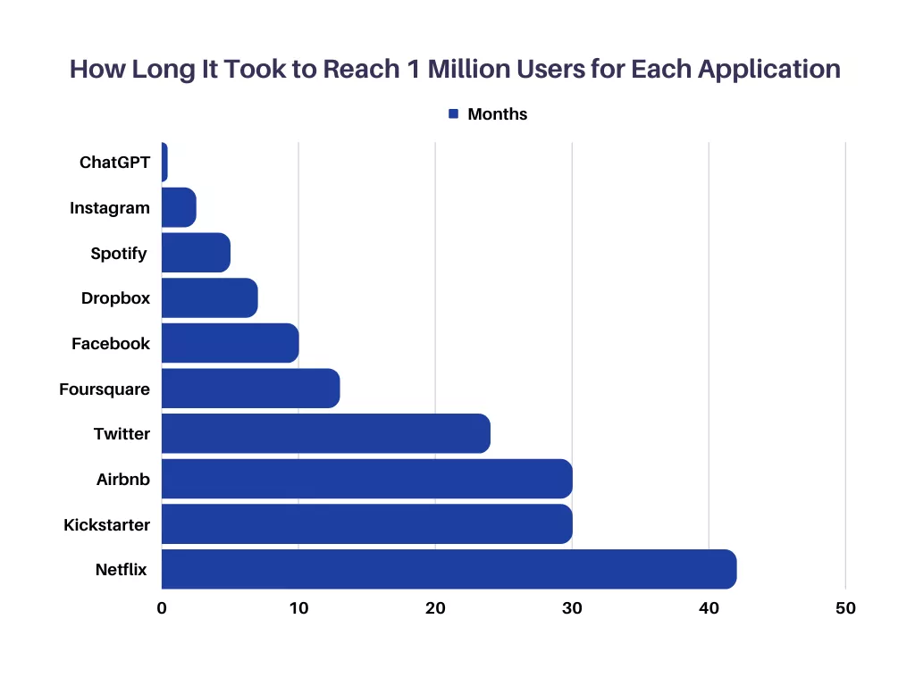 ChatGPT 的用户群正在迅速增长。已经达到了第一个100万用户一周内取得了里程碑式的进展,并击败 Instagram 成为最快实现这一目标的应用程序。