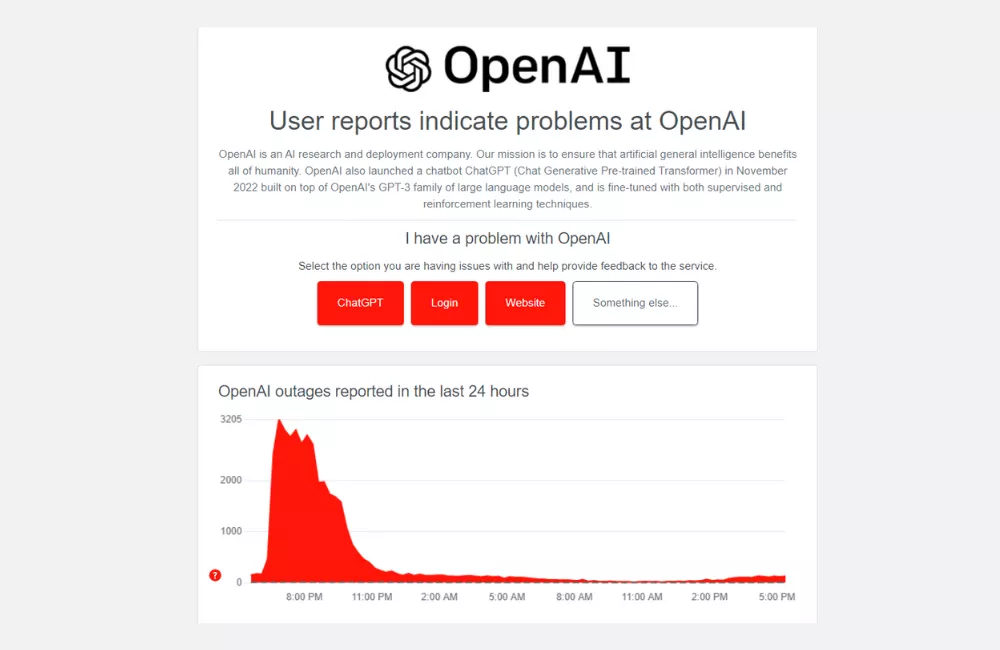 容量错误也可能是因为 ChatGPT 服务器正在维护。要检查是否属于这种情况,请访问下降探测器,在搜索栏中输入“OpenAI”,然后单击“搜索”。如果报告的问题很多,您别无选择,只能等待 OpenAI 修复它们。