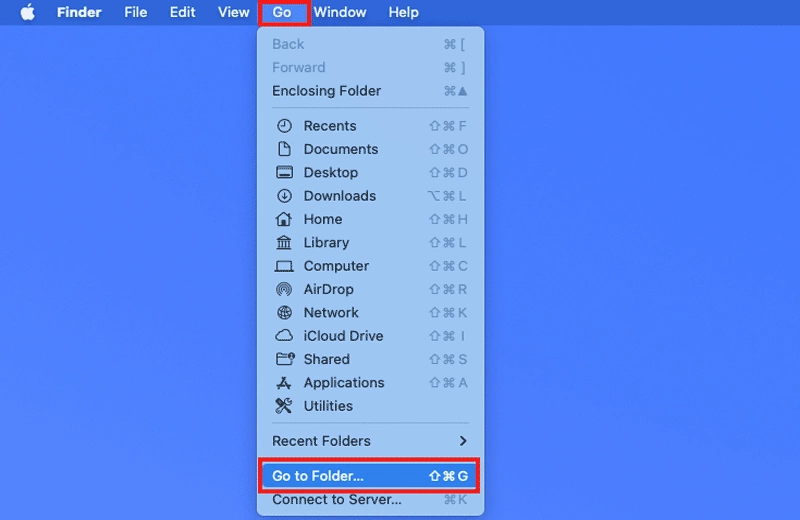 步骤一:打开 Finder 并单击“前往”选项卡以展开更多选项。然后单击转到文件夹...
