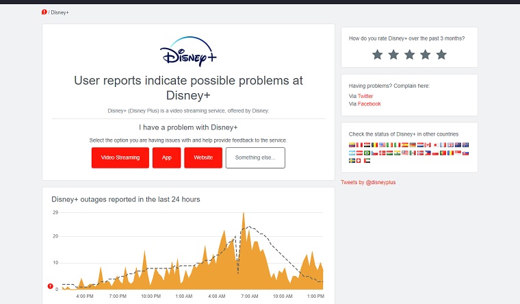 如果您在使用 Disney Plus 时遇到问题,则该平台的流量可能很高,导致流媒体内容出现困难。要检查是否属于这种情况,您可以访问下探测器,这是一项用户可以报告问题并跟踪中断情况以查看问题是否普遍存在的服务。如果问题是由于流量大造成的,唯一的解决办法就是等待迪士尼自行解决问题。