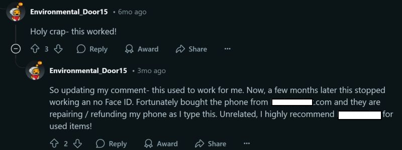 对第三方商店要小心——Face ID 硬件与逻辑板绑定(在某些型号上),未经授权的维修通常会完全禁用它。