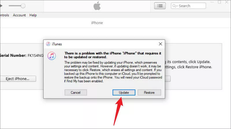 4. 一旦 iTunes 或 Finder 提示您选择更新或恢复选项,请选择更新。