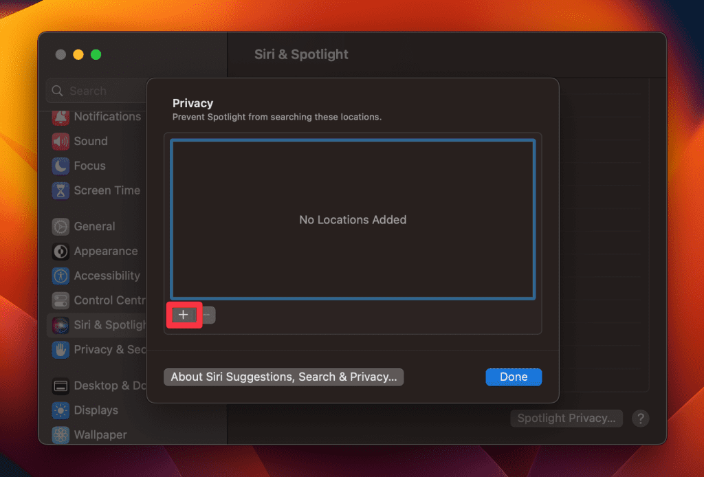 - 添加驱动器后,等待几分钟,然后选择它并单击–按钮。这将触发 Spotlight 重建其索引。