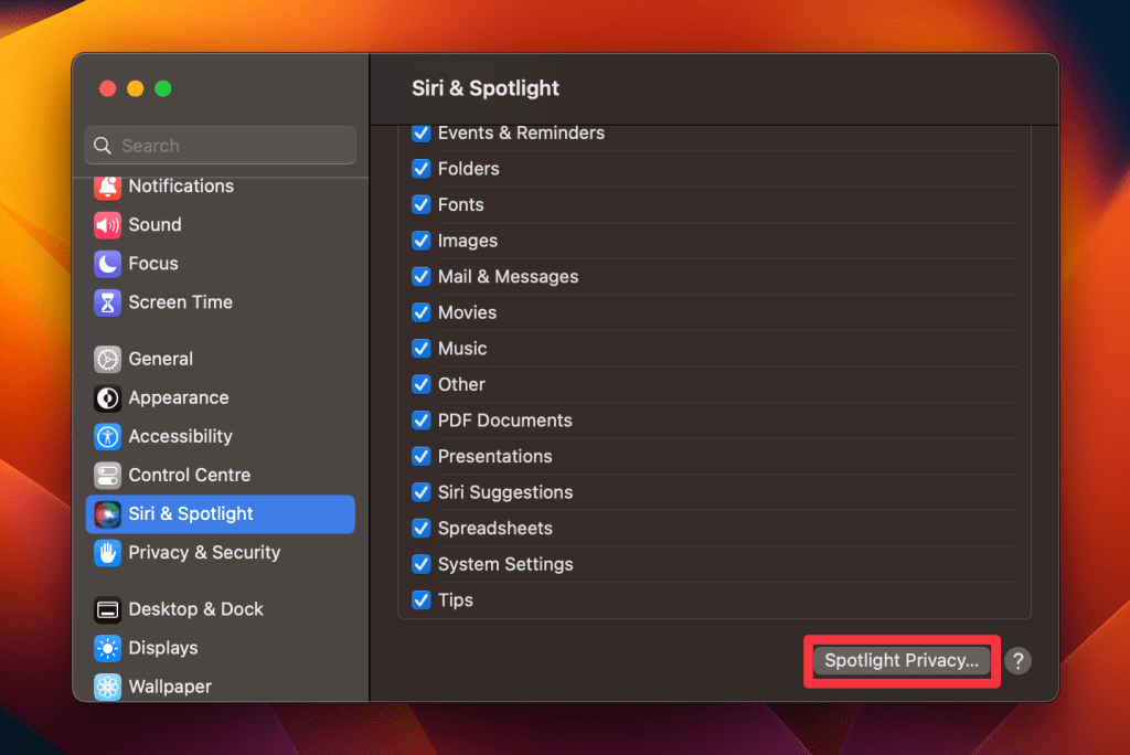 - 将启动磁盘添加到隐私列表,Spotlight 将停止为其内容编制索引。
